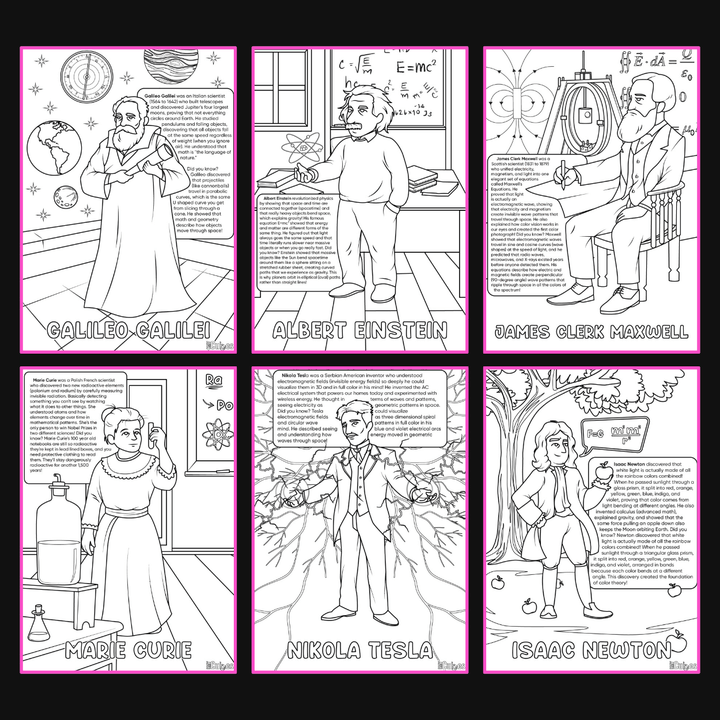 Discover the amazing mathematicians, scientists, and innovators who shaped our world through the power of shapes, colours, and patterns! This colouring book brings together 6 extraordinary pioneers who unlocked the secrets of light, colour, electricity, and the universe itself.