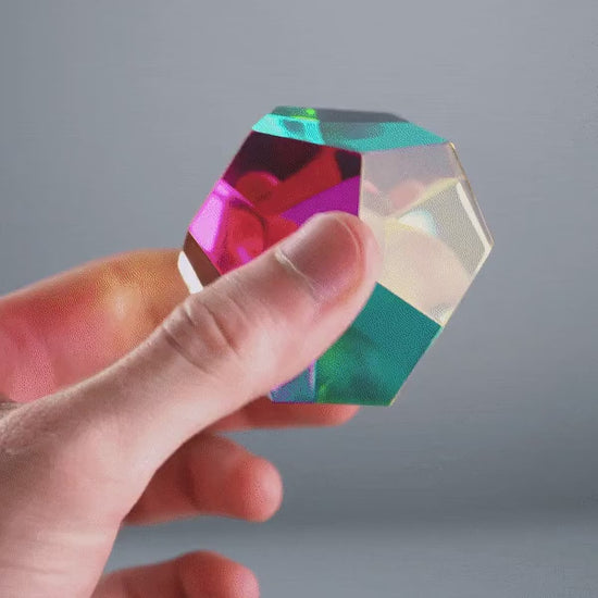The Mundus is a one kind CMY dodecahedron. It's a beautiful 12 sided polyhedron created from 12 pentagons and acts as a kaleidoscope when spun around, creating new colours at every angle. It is one of the 5 Platonic solids.
