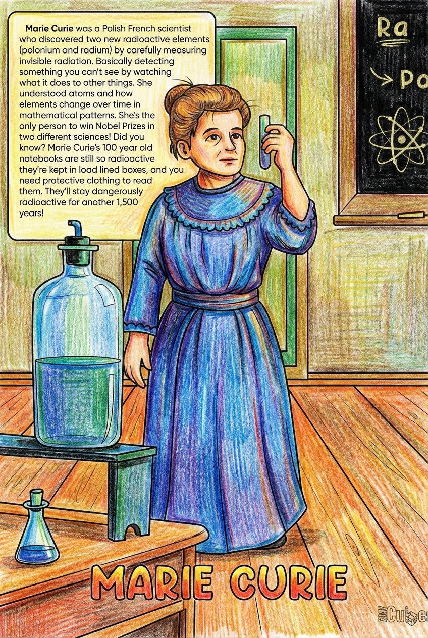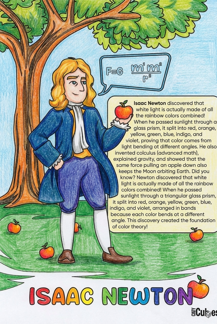 Meet the revolutionary scientists Isaac Newton, James Clerk Maxwell, Albert Einstein, Nikola Tesla, Galileo Galilei, and Marie Curie. These pioneers discovered that white light contains all colours, that light is an electromagnetic wave, and that space and time are connected. From splitting light through prisms to bending spacetime, they showed how waves, curves, and geometric patterns govern everything from rainbows to gravity. Their work with colours, shapes, and energy transformed our understanding of reality!