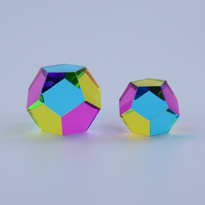 The Mundus is a one kind CMY dodecahedron. It's a beautiful 12 sided polyhedron created from 12 pentagons and acts as a kaleidoscope when spun around, creating new colours at every angle. It is one of the 5 Platonic solids.